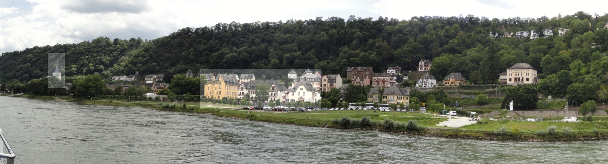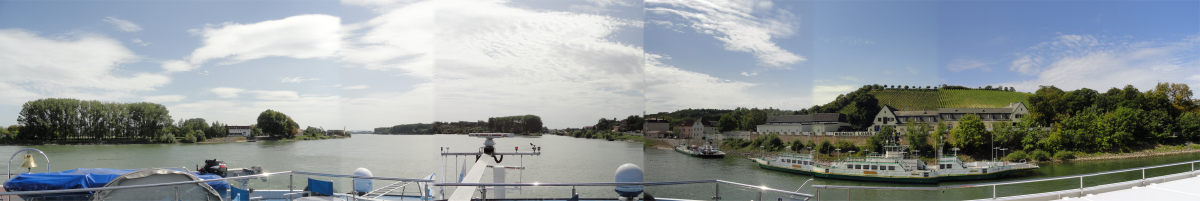 Like the St. Goar panorama photo above, this Oppenheim pan is stitched together from several photos made from the deck of a moving boat, so the seams in many cases are very rough, particularly on the west bank where three instances of the same ferry overlap each other. Still, it gives you a rough idea of what the river is like at this particular crossing site.
