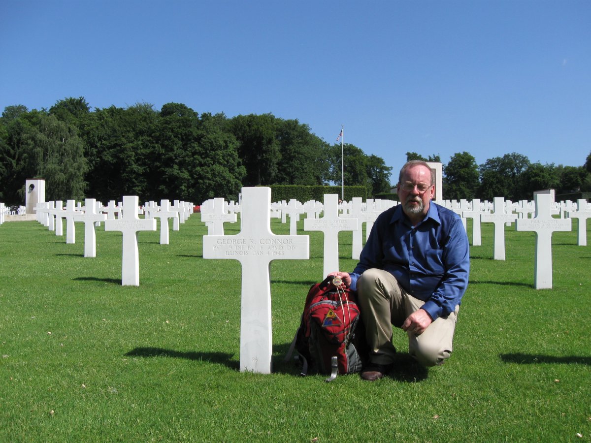 While photographing in Section H, the largest section and near the end of our project, I came across the grave of Roger Connor's dad, George, who was killed on January 4, 1945, in Wardin, Belgium. I asked Daniel to take a special photo at that site.