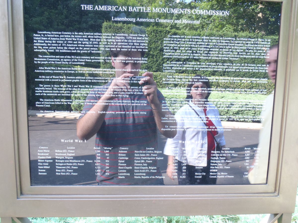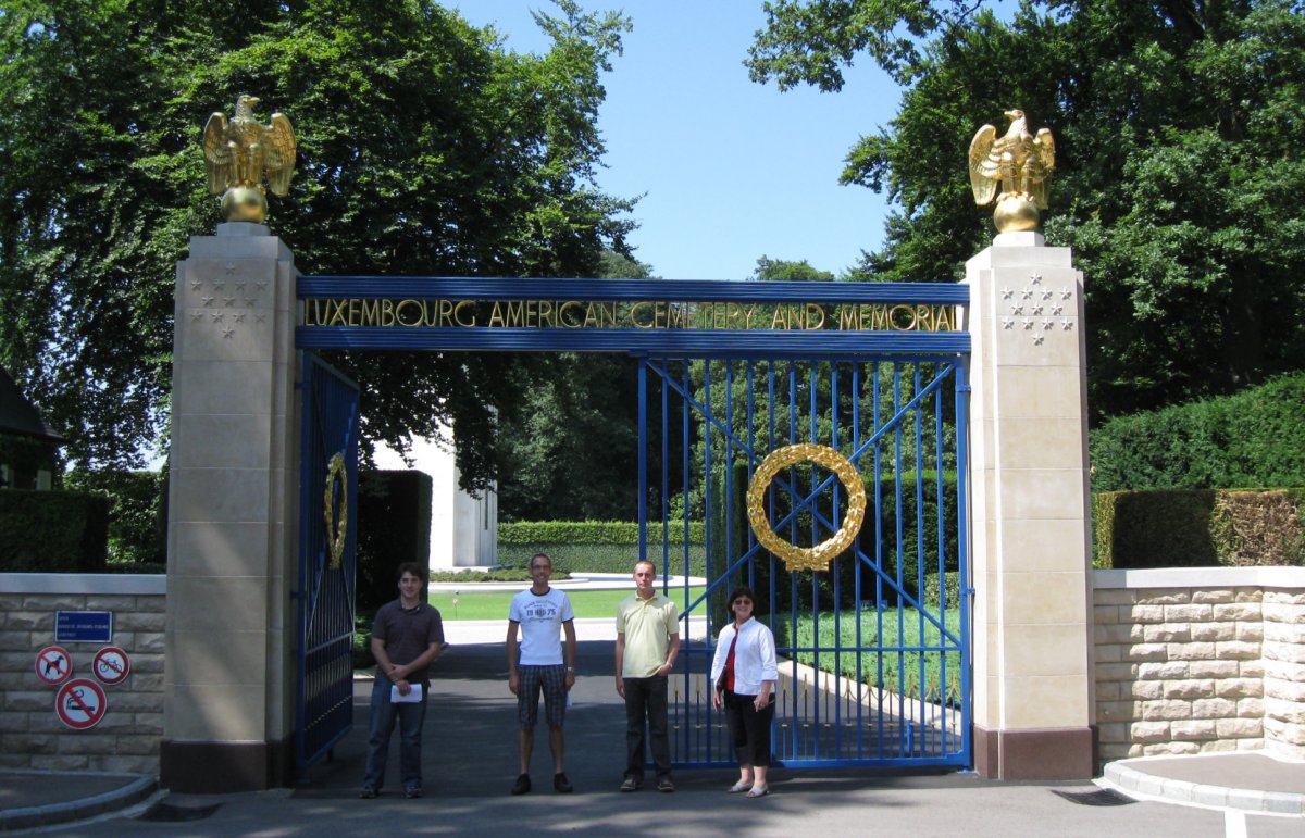 Once we went inside the gates, we visited the office where we met Erwin Franzen, Hamm cemetery Associate and Luxembourg citizen. Erwin was manning the office alone while the superintendent was visiting another American cemetery on business. Erwin, as Roger has reported from earlier visits is very knowledgeable and helpful, and he accompanied us outside to the monuments at the top of the cemetery, where he shared much history with us. Here we also met Nico Schroeder, an amateur historian and photographer who was about 10 years old during the liberation. Nico maintains photo albums at https://cantu1934.spaces.live.com.