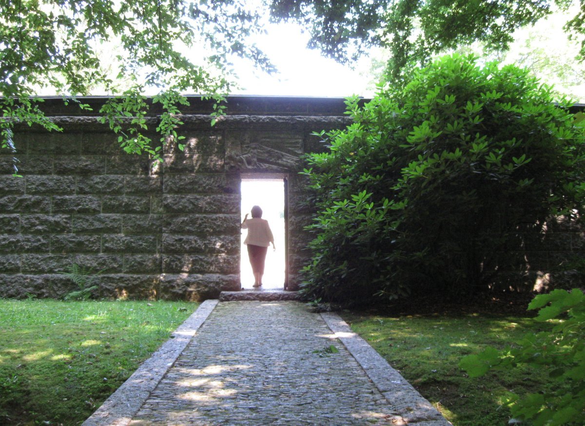 The gravesites are on the other side of a massive, dark stone wall with a single doorway: