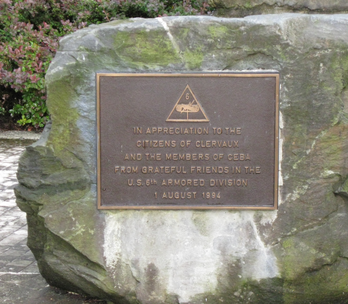 And here is a close-up of a plaque dedicated by the Sixth Armored Division Association in 1994, to the people of Clervaux.