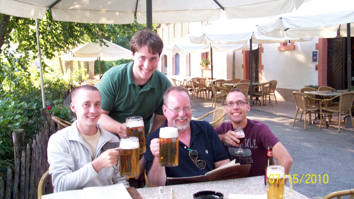 The service was friendly, and the food was good, and best of all, they served Diekirch in enormous mugs. It was truly a fitting end to a wonderful two day journey. Joan snapped the final photo, which I think sums up my family's feeling: we were fortunate to gain such a good friend as Daniel Reiland, and we have a great appreciation for the US Veterans Friends, Luxembourg. We are deeply indebted to Daniel and the USVFL for making our visit to Luxembourg one of the high points of our lives. Thank you, Daniel, and thank you, Luxembourg.
